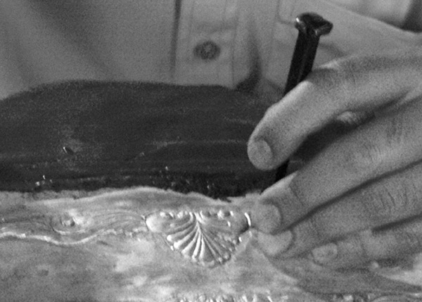 In this process the chaser makes a wooden block, puts on shellac and the sheet is pressed on it at the right temperature, so that it adheres to it. The exact detail of the design are first made using a sharp tool. The sheet then goes through an extensive process of hammering from the front as well as the back using a variety of punches, chisels and hammers. The dents around the area are removed by filing it or sand papering it. For polishing micro motors are used. Tiny little buffs with abrasive hair are used to even out the surface.